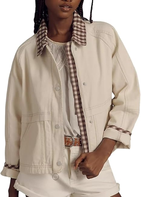 Women's Casual Button Front Jacket Loose Plaid Cuffs Collar Fashion Outerwear